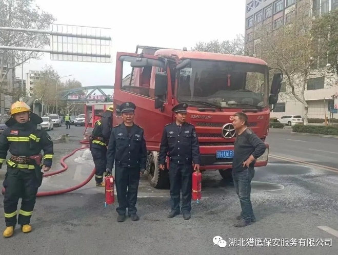 面對突如其來的變故,貨車司機緊急停車,下來時由于過度緊張,以至于重重摔倒在地,當時司機疼痛難忍,更不知何滅火。危急關(guān)頭,我公司駐荊楚理工學院東門的保安員金鵬程(男,55歲,中共黨員,荊門城區(qū)人)和趙兵(男,55歲,漳河新區(qū)人)發(fā)現(xiàn)險情后,迅速從值班室提起滅火器沖向著火的貨車,一左一右對準起火部位進行噴射滅火。