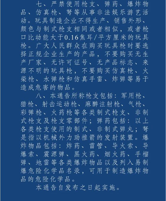 八、本通告所稱槍支包括:軍用槍、獵槍、射擊運(yùn)動(dòng)槍、麻醉注射槍、氣槍、彩彈槍、火藥槍等各類制式槍支、非制式槍支及槍支零部件;彈藥包括:以上各類槍支使用的制式、非制式彈丸;弩是指以機(jī)械外力助推箭的發(fā)射裝置。爆炸物品包括:炸藥、雷管、導(dǎo)火索、導(dǎo)爆索、震源彈、黑火藥、煙火藥、手榴彈、地雷等各類爆炸物品以及列入易制爆危險(xiǎn)化學(xué)品名錄,可用于制造爆炸物品的危險(xiǎn)化學(xué)品。