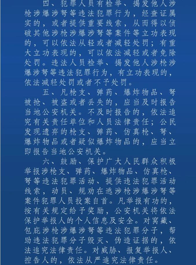 二、凡違反上述規(guī)定的,必須立即停止違法犯罪行為并投案自首,將非法槍支、彈藥、爆炸物品、仿真槍、弩上交當(dāng)?shù)毓矙C(jī)關(guān)。